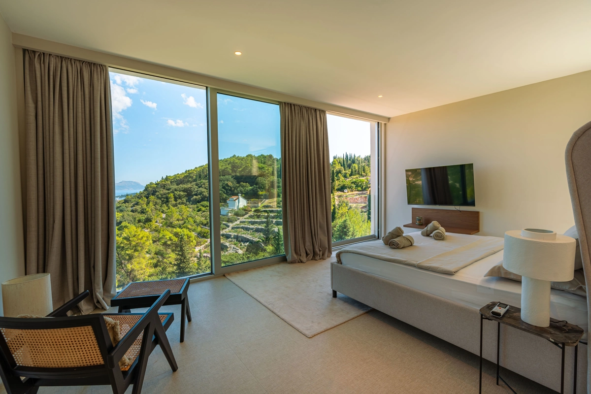 panoramski pogled iz svih prostorija vila, vrtova i terasa na stoljetnu borovu šumu, Pelješac i Korčulanski kanal