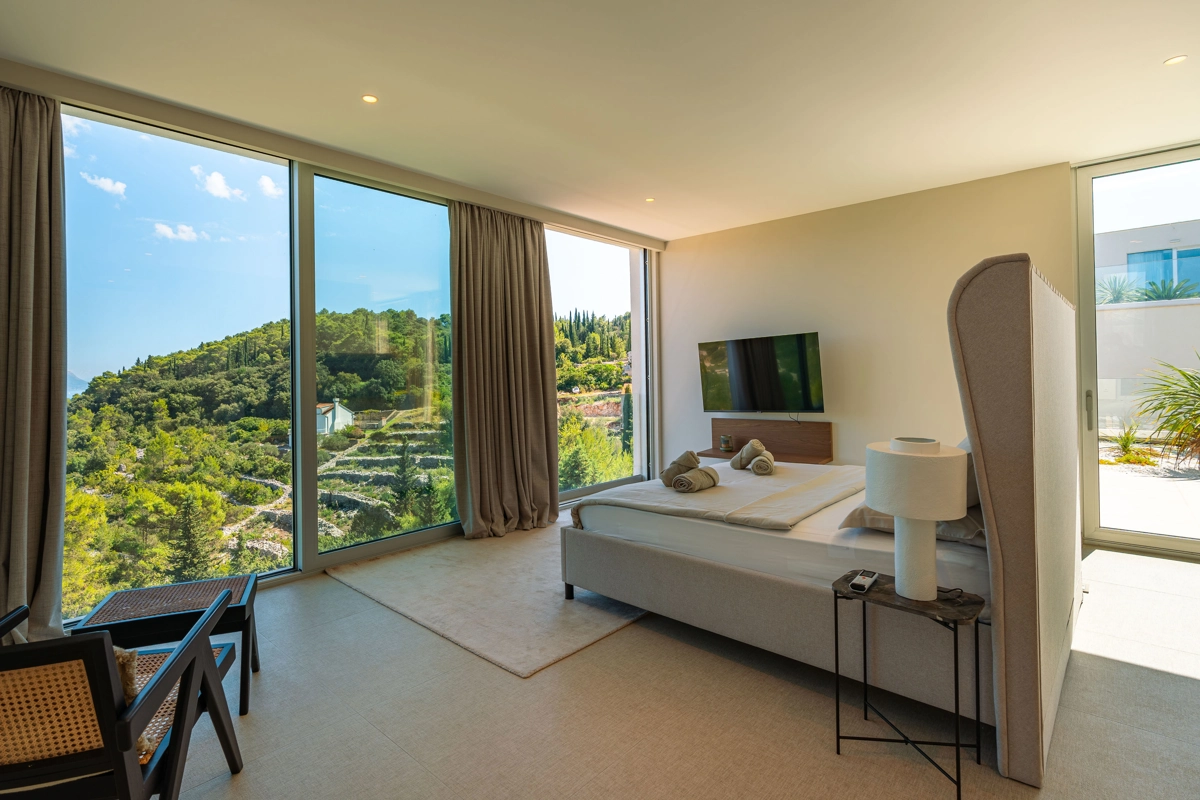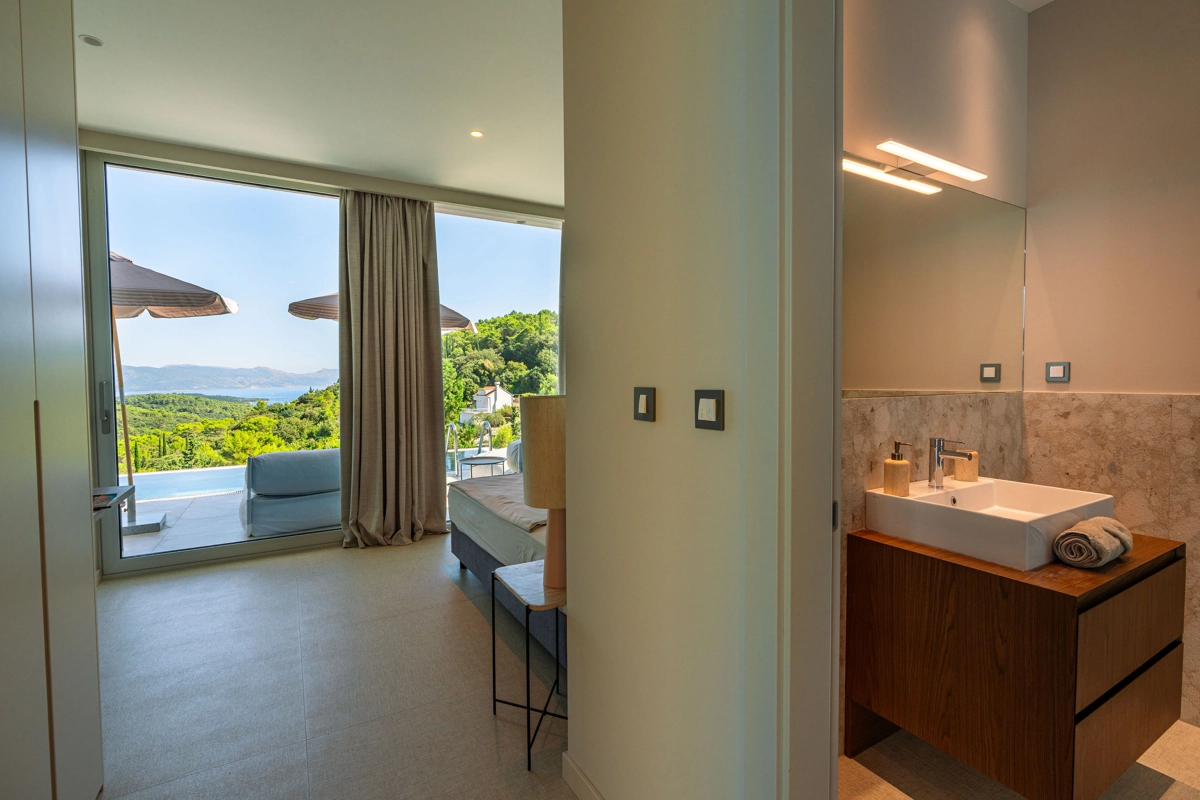Suvremena arhitektura, minimalistički dizajn interijera i eksterijera. Iz vile se pruža prekrasan pogled na grad Korčulu, Badiju i zelenilo.