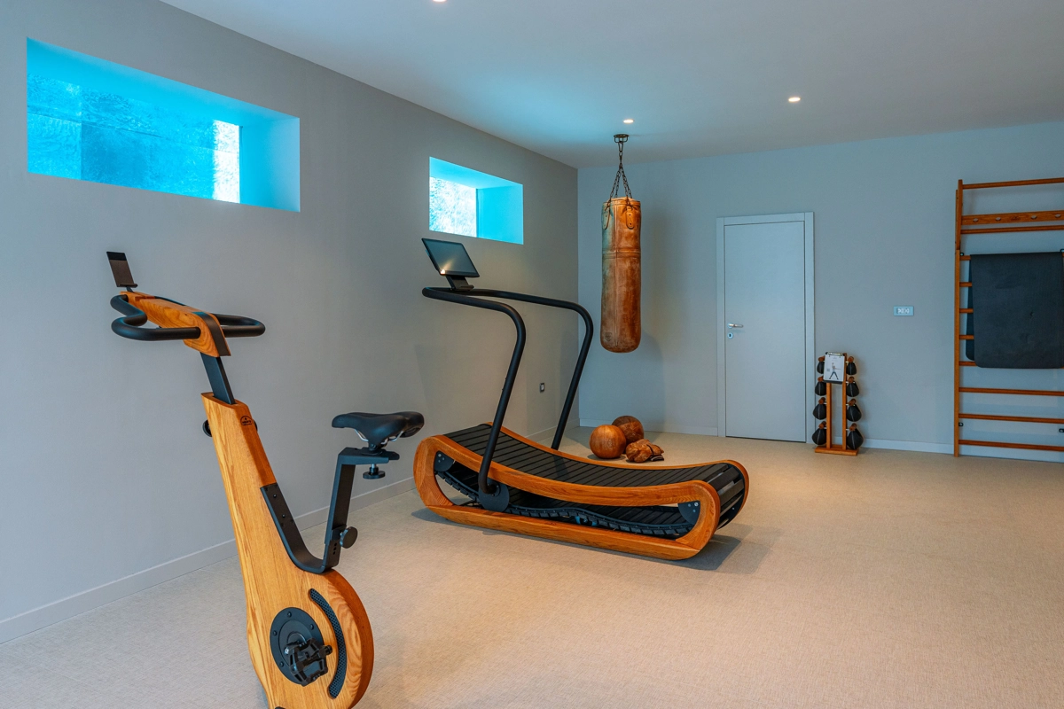 teretana i wellness s pogledom kroz prozor na dubinu bazena
