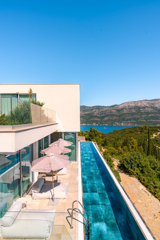 Suvremena arhitektura, minimalistički dizajn interijera i eksterijera. Iz vile se pruža prekrasan pogled na grad Korčulu, Badiju i zelenilo.